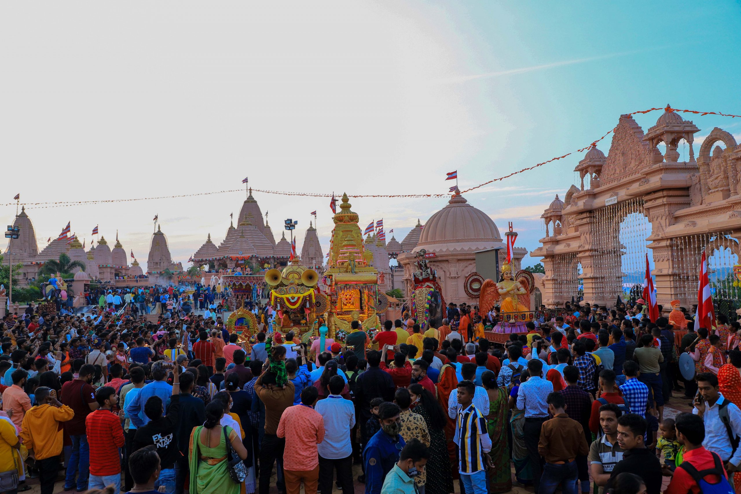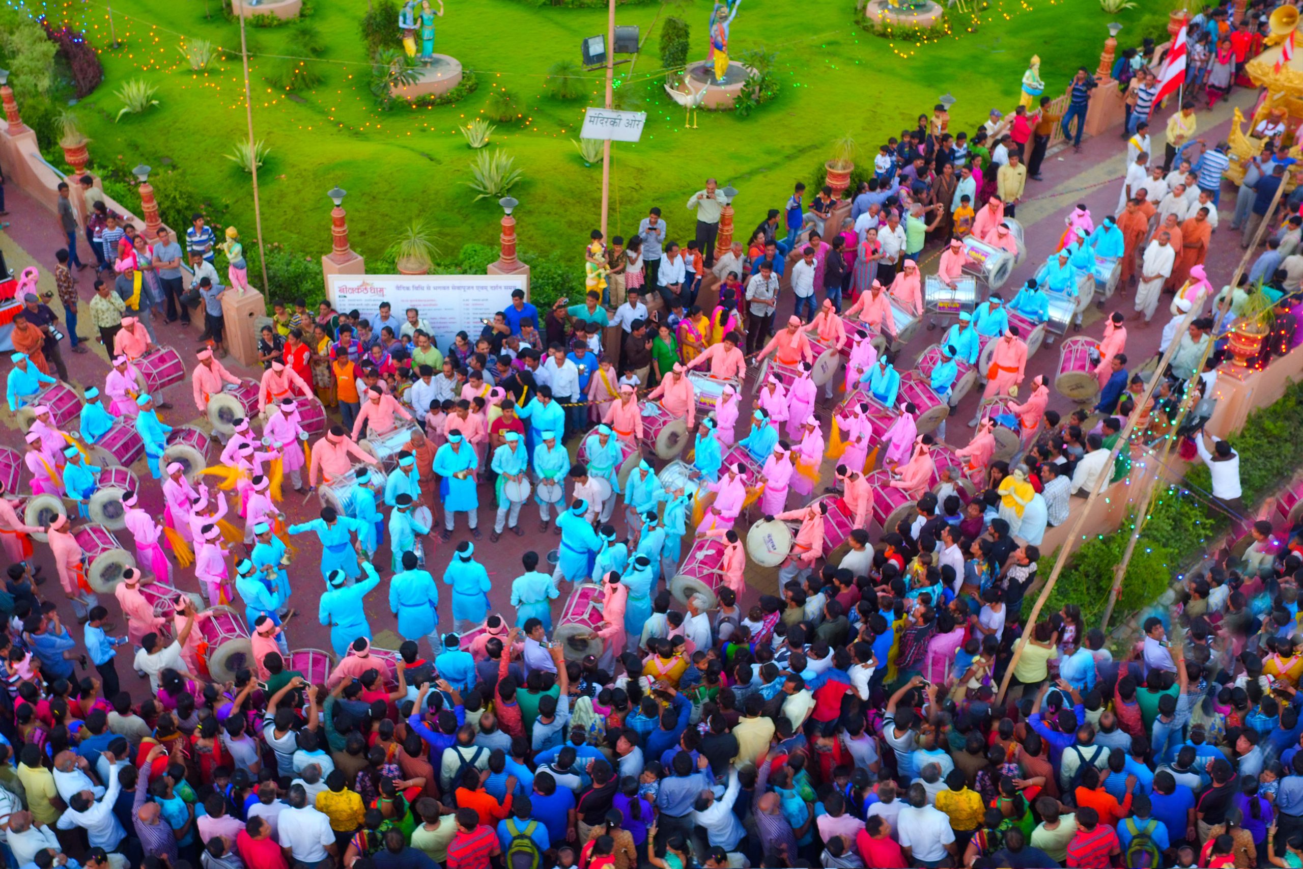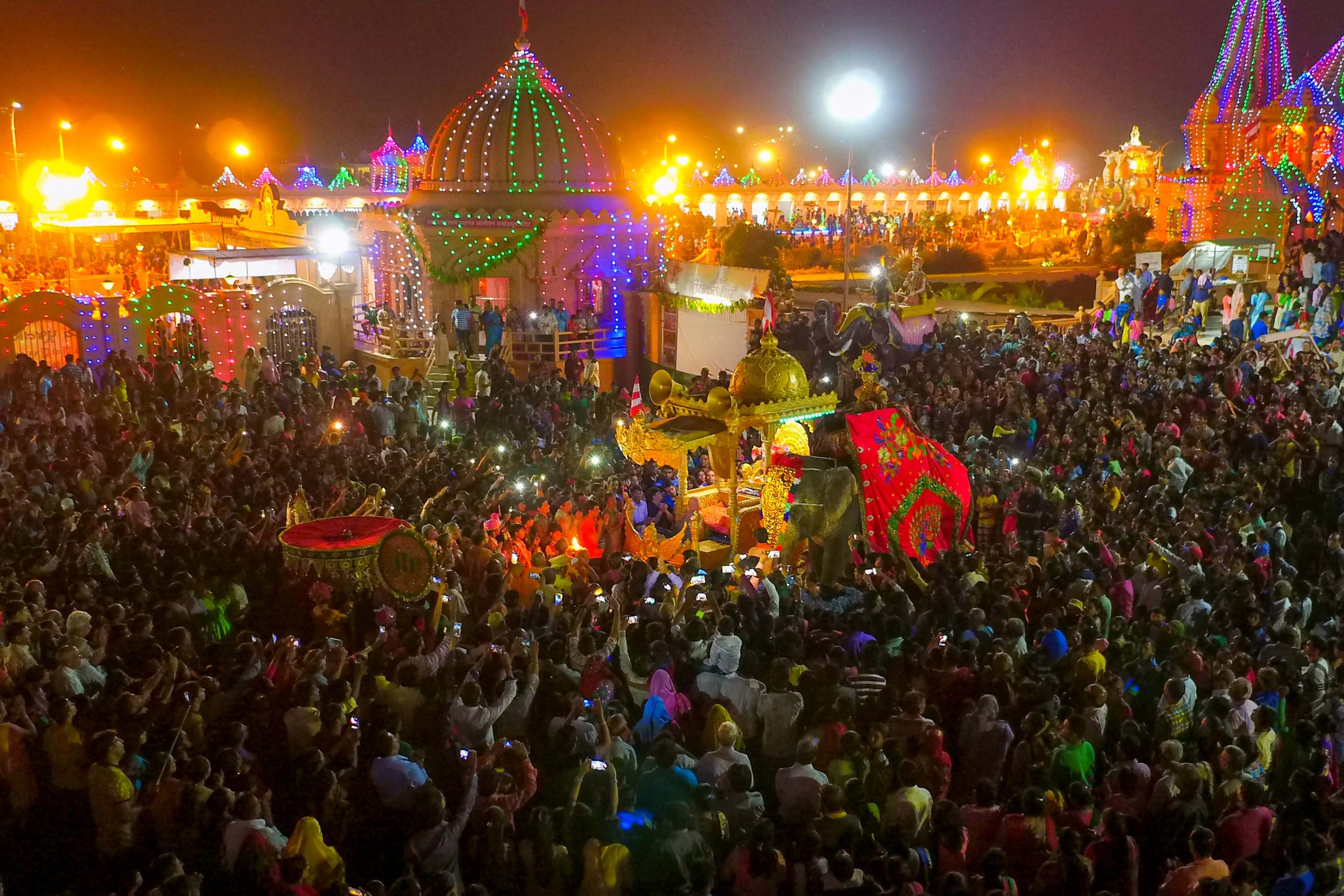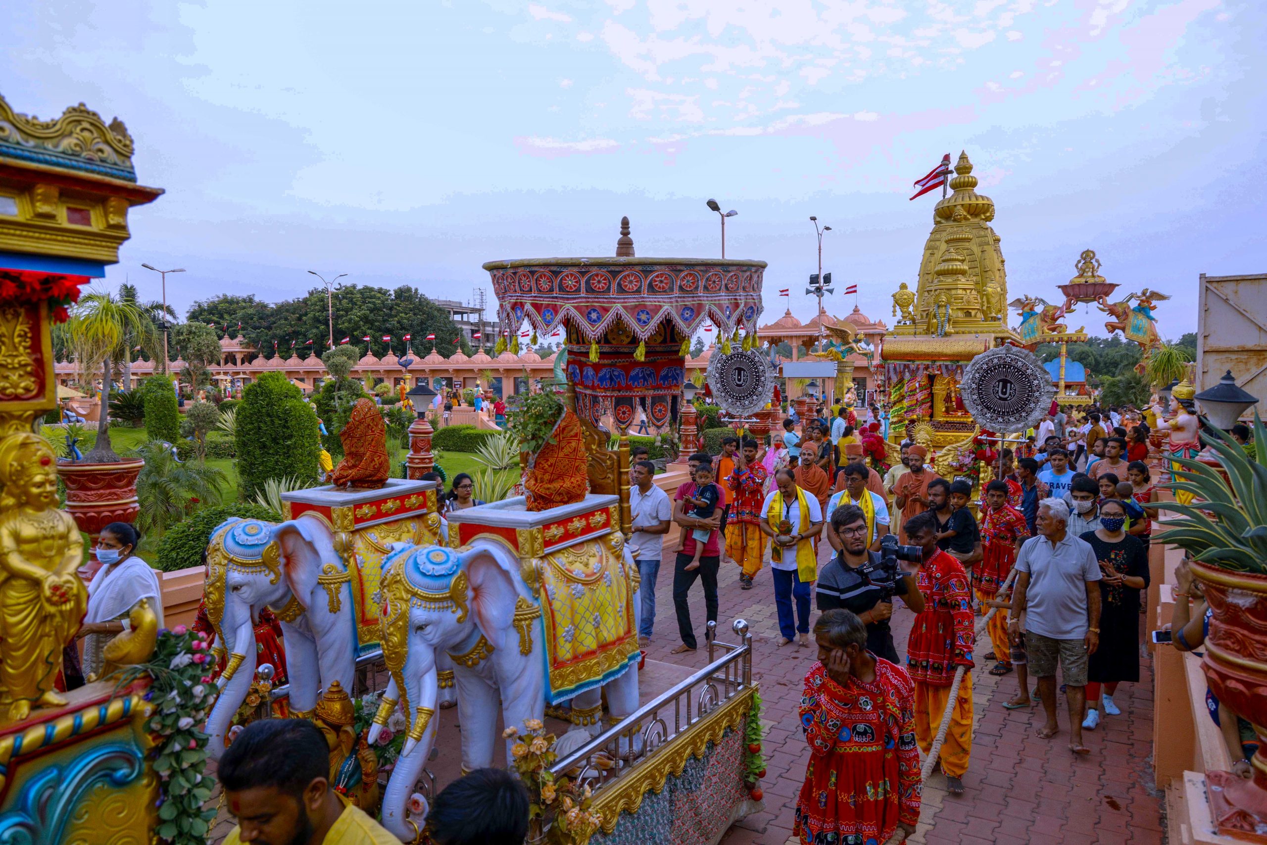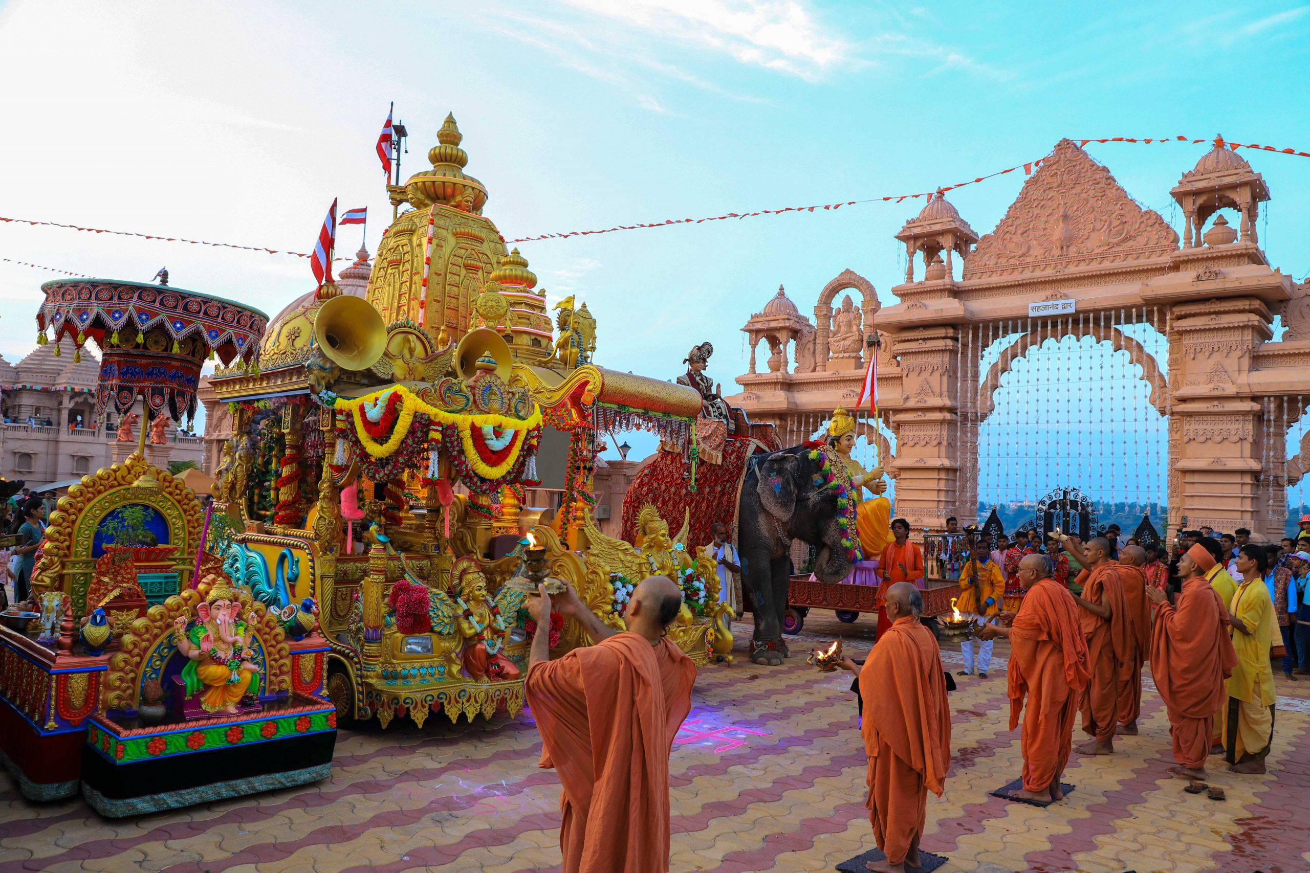 There is a huge army of canons, decked cows, horses, elephants, flags, musicians accompanying ear-pleasing music, and so on the list goes.. It also has a troupe of saints singing devotional songs to the accompaniment of musical instruments.. Hundreds of youths, teenagers and children adorned in traditional Indian costumes added spice to the grand event. There are five aaratis altogether getting offered throughout the procession. Never before had the world has seen something as colorful and joyous as the procession at Neelkanth Dham.