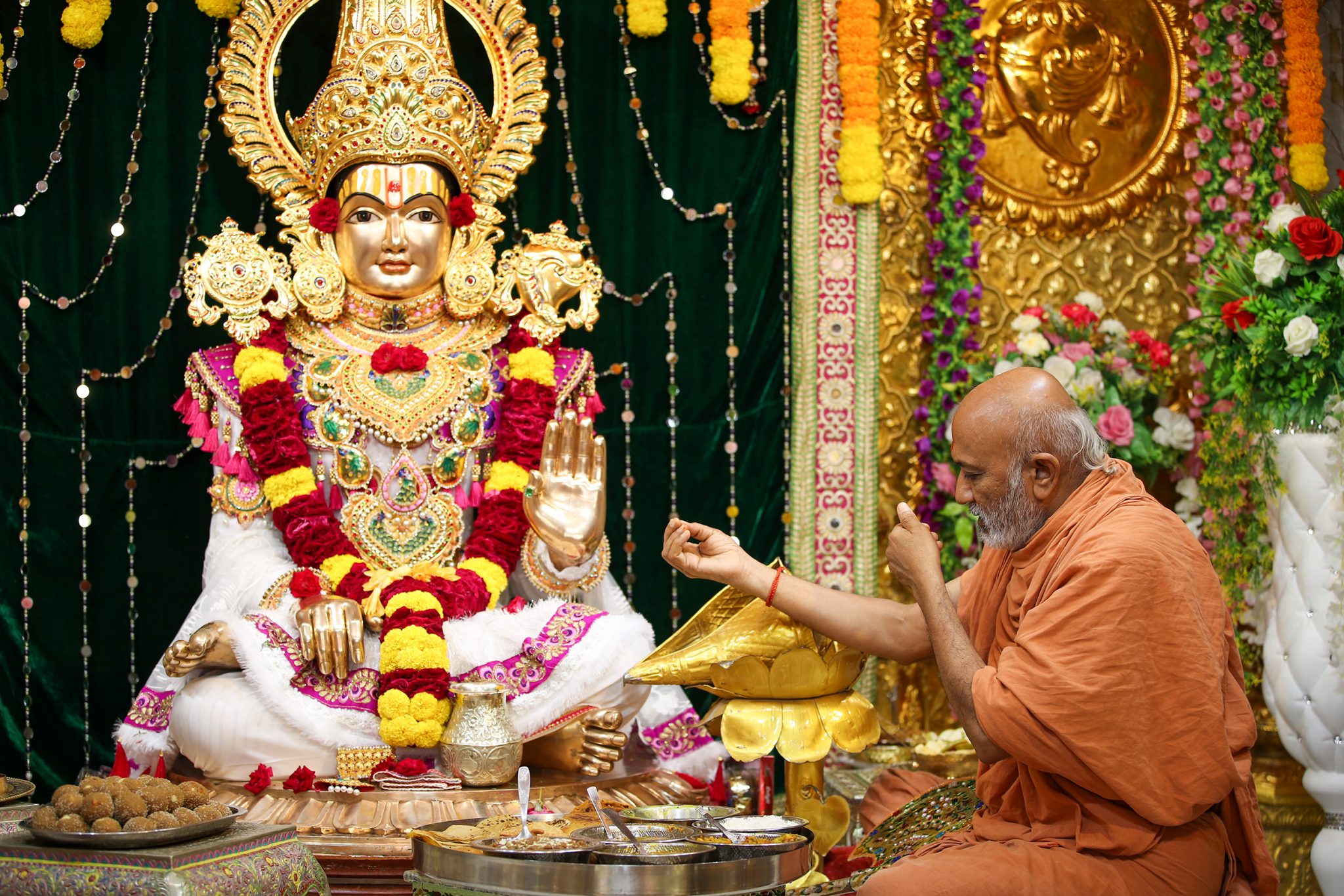 A great variety of mouth-watering food-dishes(Thal), to be precise nine times a day, are offered as sentimental and faith-awakening worship to The God. Varni Prabhu is adorned with Golden AANGI( Ceremonial cloth made of sheer gold) at 4 in the afternoon.